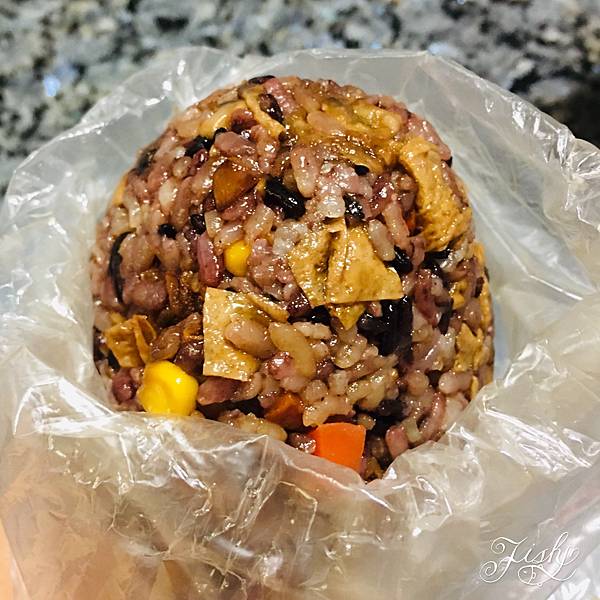 紫穀珍香飯糰,是將菜脯、香菇、杏鮑菇、玉米、豆皮、紅蘿蔔炒香後