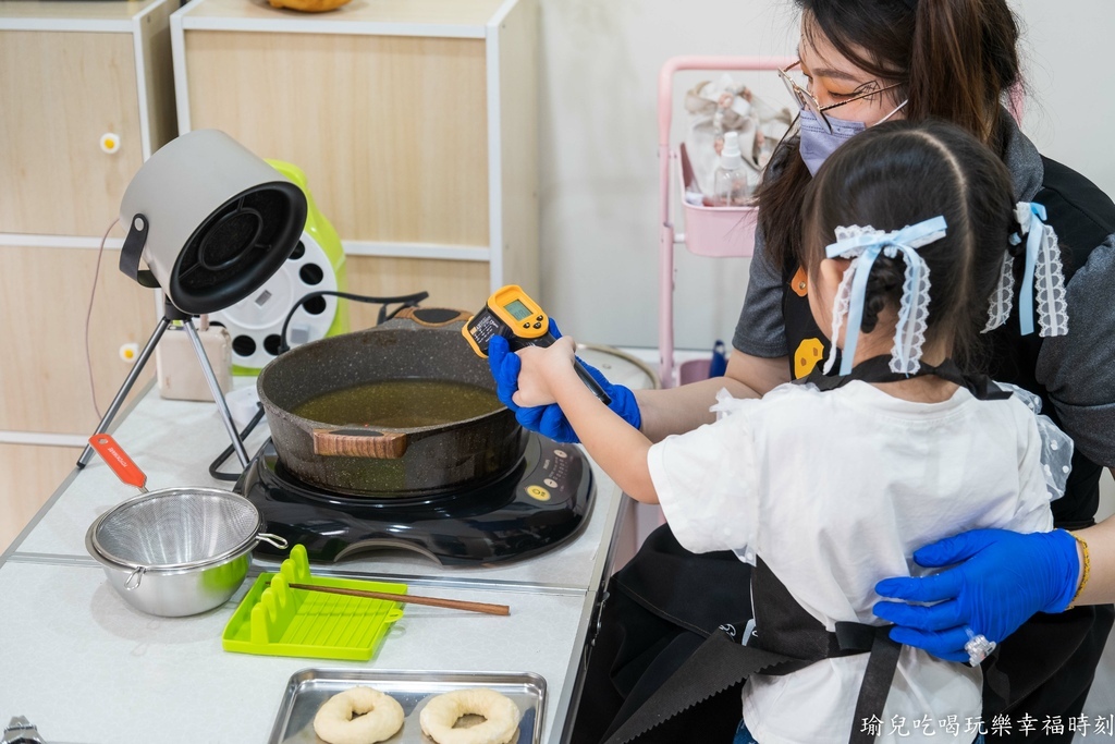 在甜甜圈入鍋油炸的過程中,老師會特別注意安全。孩子只需要把自己做好的甜甜圈交給老師,然後把小手揹在後面,待在老師身後看著麵糰在油鍋裡慢慢膨脹、轉成金黃色,最後出鍋瀝油。